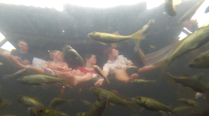 Ensuite, nous nous sommes arrêtés dans une des maisons et avons eu la surprise de pouvoir se faire faire une pédicure par des poissons !